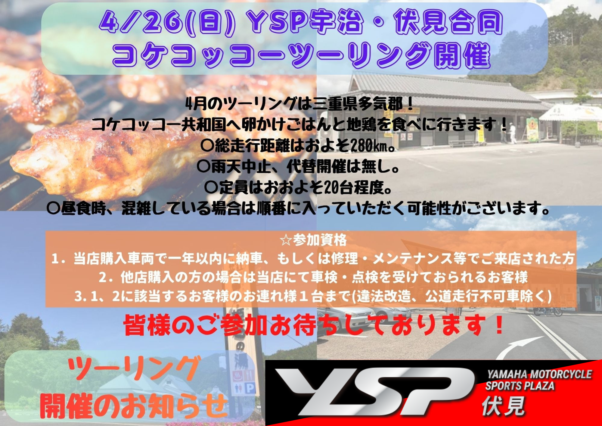 こんにちは! 4/26(日)に2026年度第2回ショップツーリングを開催いたします! 今回は三重県にあるコケコッコー共和国を目的地としたツーリングです(/・ω・)/ 総走行距離は約280Km程度のコースとなる見込みです! 参加希望の方は「4/26ツーリング参加」とLINEにご返信いただくか店頭にて参加希望をお伝えください! 皆様のご参加お待ちしております(=゚ω゚)ノ